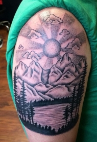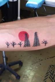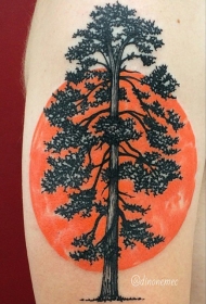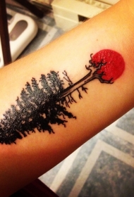 手臂old school黑色孤独大树与橙色太阳纹身图案