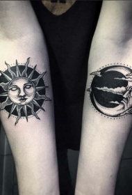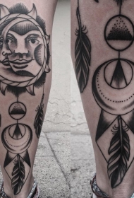 小腿点刺风格黑色月球和太阳羽毛纹身图案