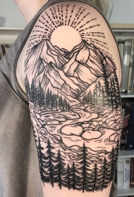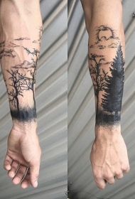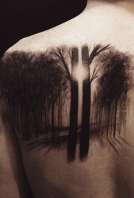 背部惊人的点刺风格黑暗森林与阳光纹身图案