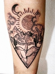 手臂上的菱形黑色线条风格山水和太阳纹身图片