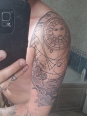 男子左手大臂上的精致的太阳能系统纹身