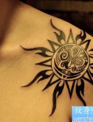 女性肩部有个性的太阳图腾纹身