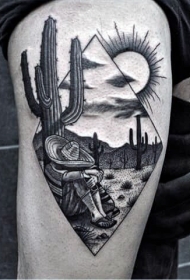 腿部黑色点画风格墨西哥牛仔仙人掌纹身