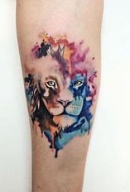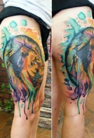 女生大腿上彩绘水彩素描七彩泼墨狮子纹身图片