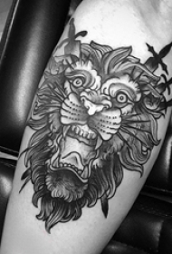 狮子头纹身图片小腿上黑色双剑刺入狮子头纹身图片