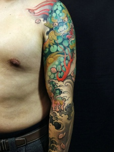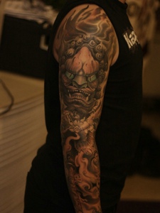 花臂唐狮纹身图案显得很有魅力