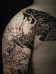 老传统黑白唐狮半甲纹身图片
