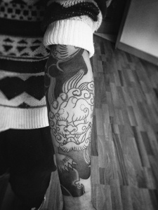 手臂帅气的黑白唐狮纹身