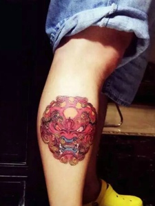 小腿部彩色唐狮纹身图案很个性