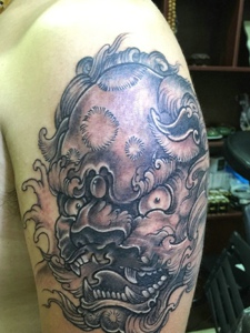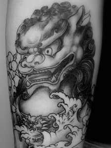 大臂经典有型的黑白唐狮纹身图案