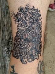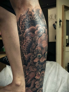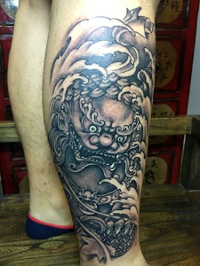 包小腿老传统黑灰唐狮纹身图案