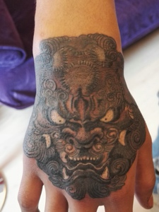 手臂黑灰般若唐狮纹身图案