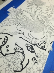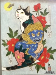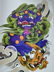 日式传统彩色纹身猫唐狮纹身图案手稿