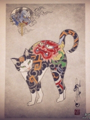 日式传统唐狮纹身猫纹身图案彩色手稿