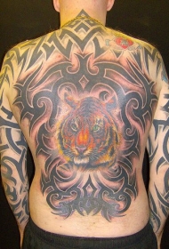 满背彩色老虎头部落纹身图案