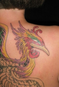 背部彩色凤凰头纹身图案