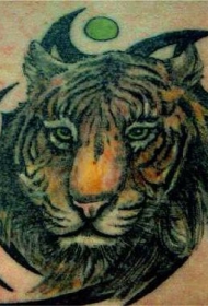 肩部彩色老虎头与绿叶纹身图案