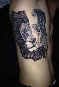 不寻常的组合彩色狮子头与女性脸部纹身图案