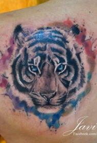 背部水彩泼墨惊人的老虎头像纹身图案