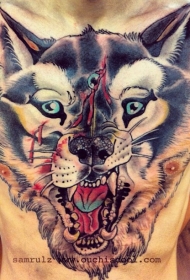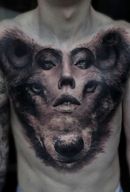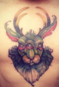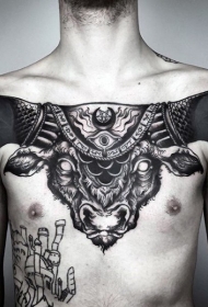 胸部彩色恐怖风格恶魔脸和山羊头纹身图案