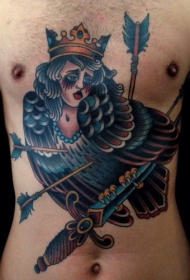 彩色腹部old school箭与匕首和人头鹰纹身图案
