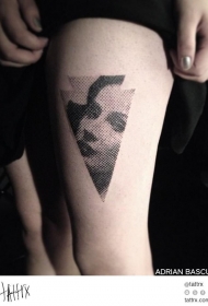 大腿点刺风格的黑色箭头和女人肖像纹身图案