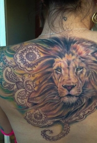 背部写实狮子头与梵花纹身图案