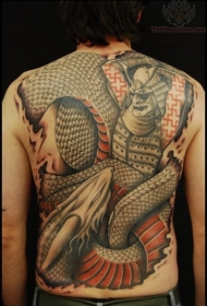 背部武士与怪物蛇纹身图案
