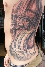 侧肋海盗船和骷髅与武士纹身图案