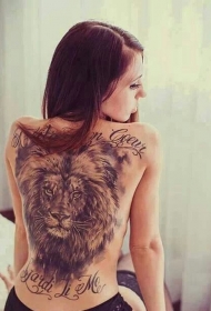 女生背部大狮子头和字母纹身图案