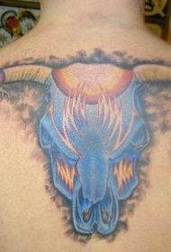 背部蓝色的牛头与火焰纹身图案
