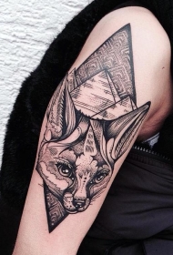 大臂雕刻风格黑色狐狸头与金字塔纹身图案