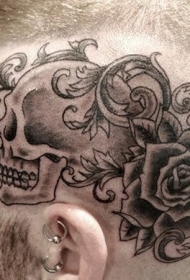 头部黑色卡通风格骷髅与玫瑰纹身图案