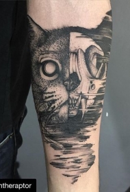 小臂雕刻风格黑色猫头与颅骨纹身图案