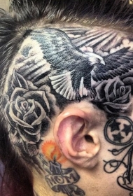 头部黑色的飞鹰与玫瑰纹身图案