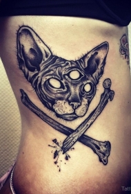 侧肋雕刻风格黑色猫头和骨头纹身图案