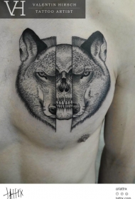 胸部雕刻风格黑色骷髅结合狼头纹身图案