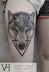 大腿神秘雕刻风格狼头心脏和黑色三角形纹身图案