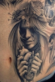 令人毛骨悚然的黑白女人头像心脏纹身图案