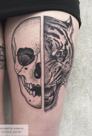 大腿雕刻风格黑色骷髅与老虎头纹身图案
