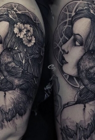 雕刻风格黑色妇女头像与乌鸦和花朵纹身图案