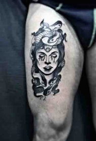 大腿令人惊叹的黑白美杜莎和蛇纹身图案