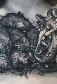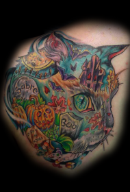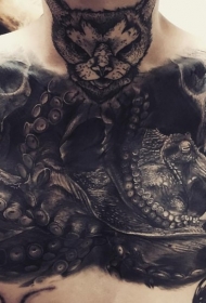 胸部难以置信的章鱼与猫骷髅纹身图案