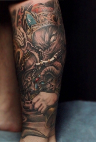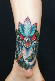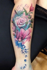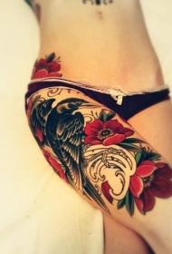 女性腿部彩色玫瑰花乌鸦纹身图案