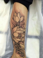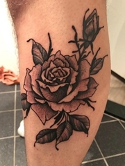 小腿上的一朵精致的黑灰色玫瑰花纹身