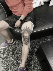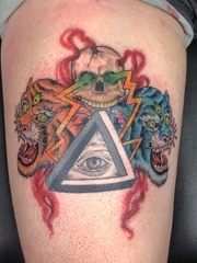 大腿上的骷髅头三眼老虎和上帝之眼纹身