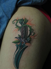 美女腿部经典的匕首藤蔓纹身图案