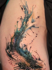 女性大腿个性彩色泼墨鱼纹身图案
