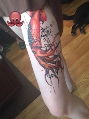 女孩左大腿上的大红鱿鱼纹身图片