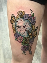 大腿上漂亮的蝴蝶花朵和花镜纹身图片